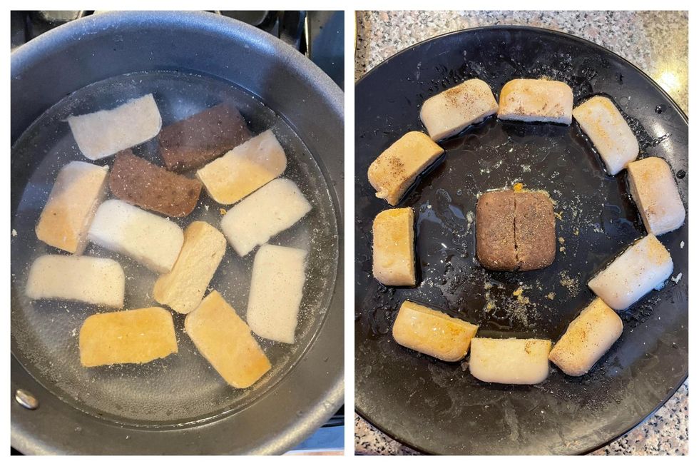 Once that was added, I began to toss the squares for 3 to 5 minutes until slightly browned and crisped.