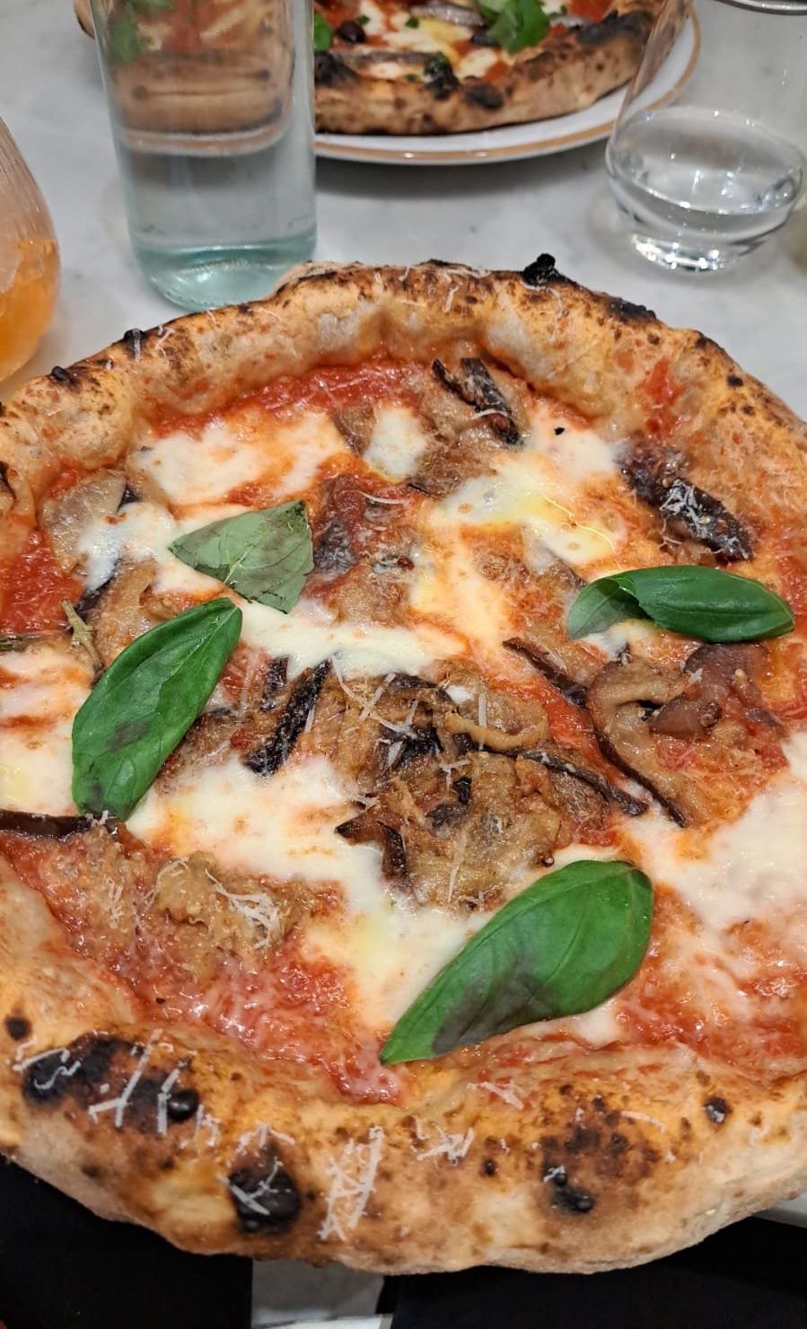 Unadventurous with my pizza choices, I opt for the humble parmigiana, a pizza with aubergines, fior di latte, parmesan and basil.