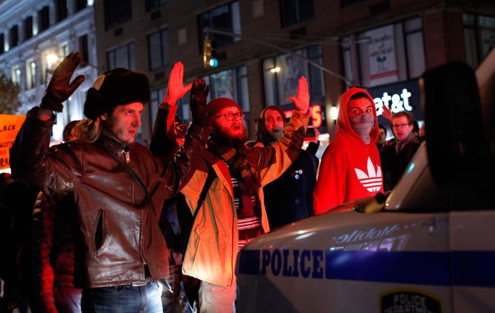 Protesters hold up their hands before police blocking traffic on the West Side Highway in New York