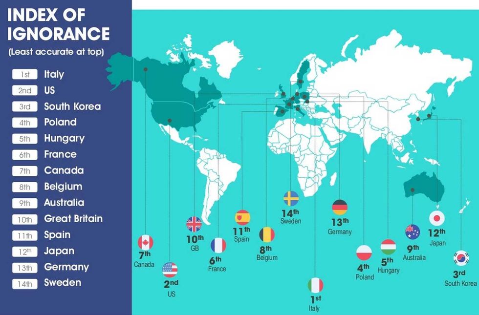 Despite that, Britain is only ranked as the tenth most ignorant country in the world (of those surveyed).