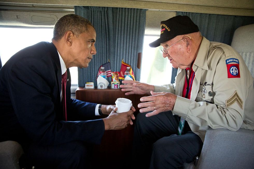 President Obama talking to World War II veteran Kenneth (Rock) Merritt, 6 June 2014.