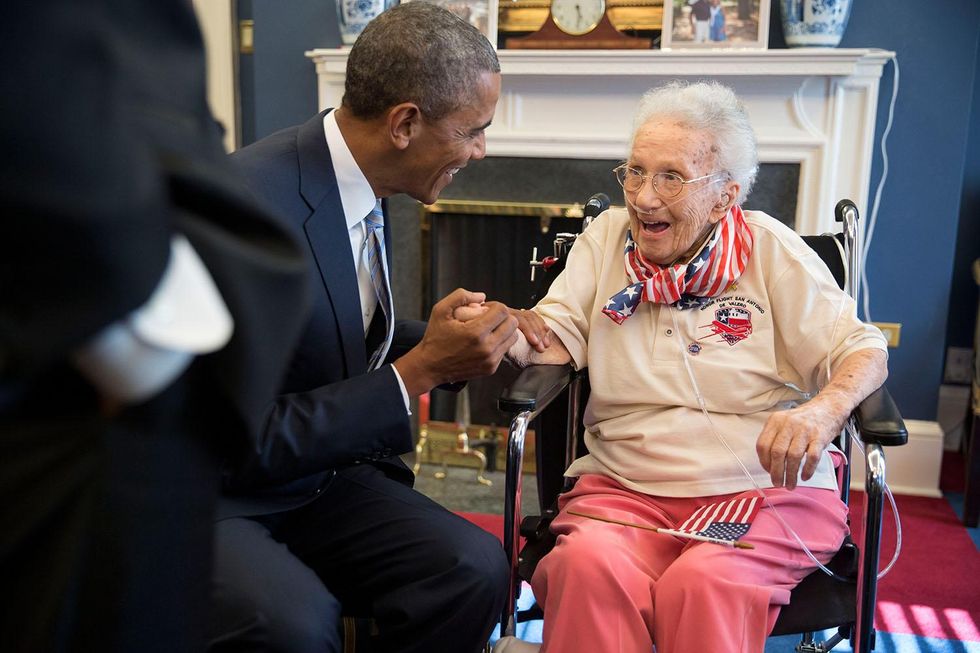 President Obama and Vice President Biden visit the oldest living female US veteran, who is 108 years old, Ms Coffey, 25 July 2014.