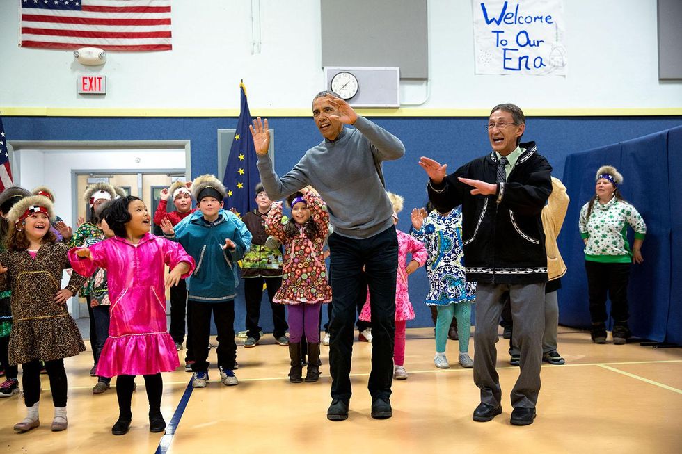 President Obama dances with students and teachers at Dillingham Middle School, in Alaska, 2 September 2015.