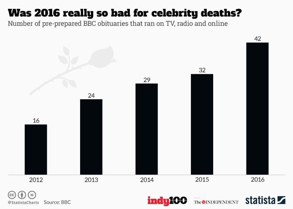 The BBC’s Obituaries Editor, Nick Serpell counted the number of pre-prepared BBC obituaries running across a number of platforms, including TV, radio and online from January until March for the years 2012-2016.