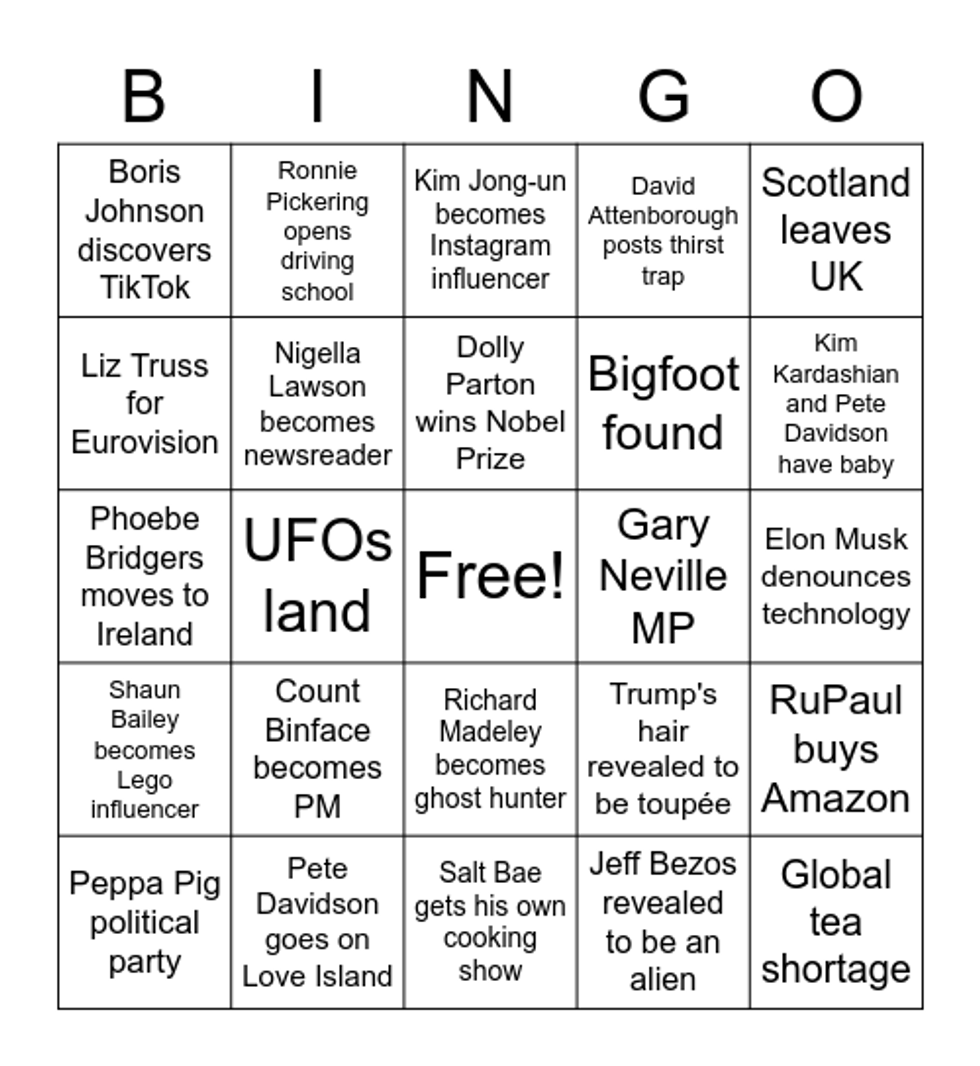 - Count Binface becomes PM: We already have a pretty rubbish PM, so this isn’t necessarily a stretch.