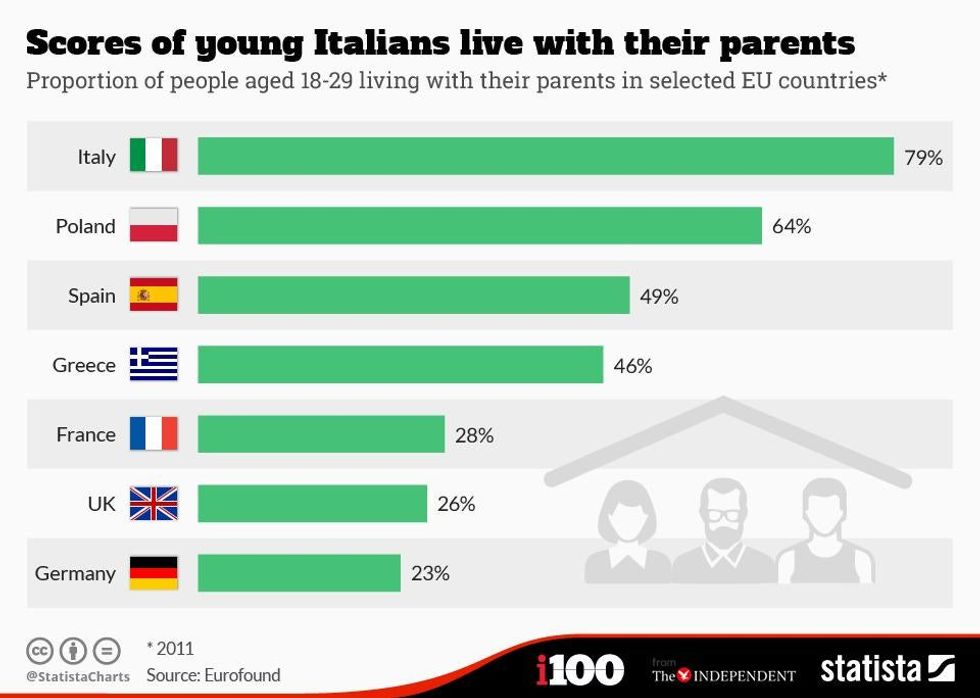 7. Young Italians, by some distance, are the most likely to live at home with their parents.