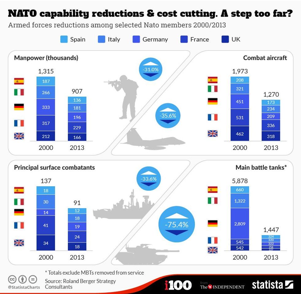 12. Italy has cut back its military spending more than any other major European Nato member.