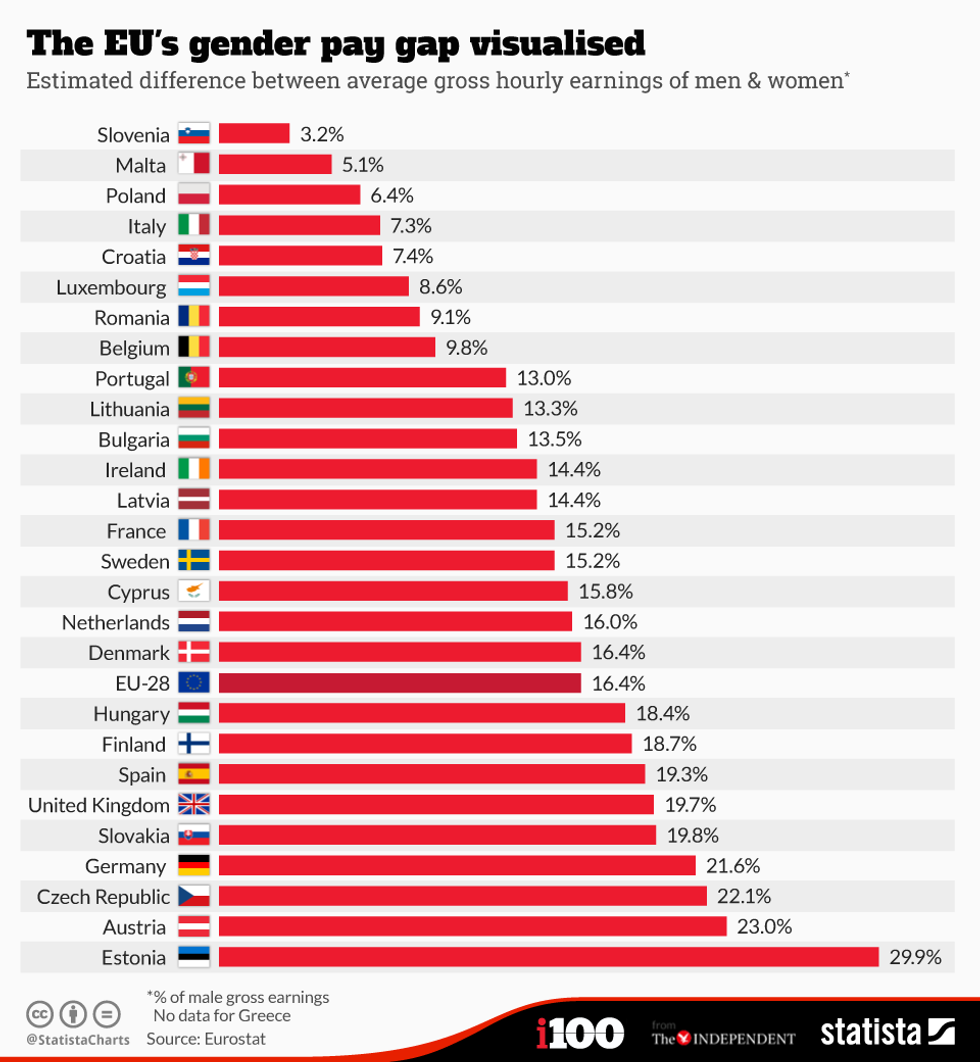 2. Slovenia, Malta and Poland have the smallest gender pay gaps.