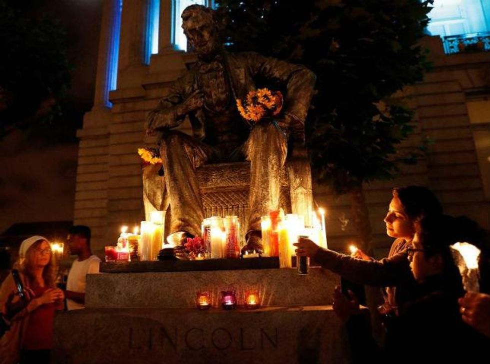 People gather around an Abraham Lincoln statue as a vigil is held in memory of the Orlando victims.