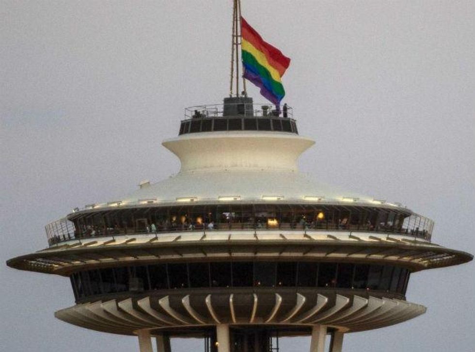 A rainbow flag flies on the Space Needle in Seattle, to remember the victims of the Orlando shooting in Pulse night club.