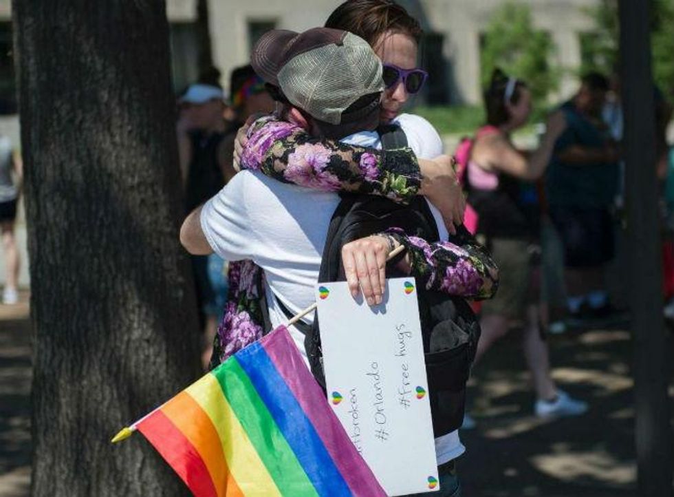 A woman offers free hugs in the streets of Washington, in memory of the victims of the Orlando shooting.
