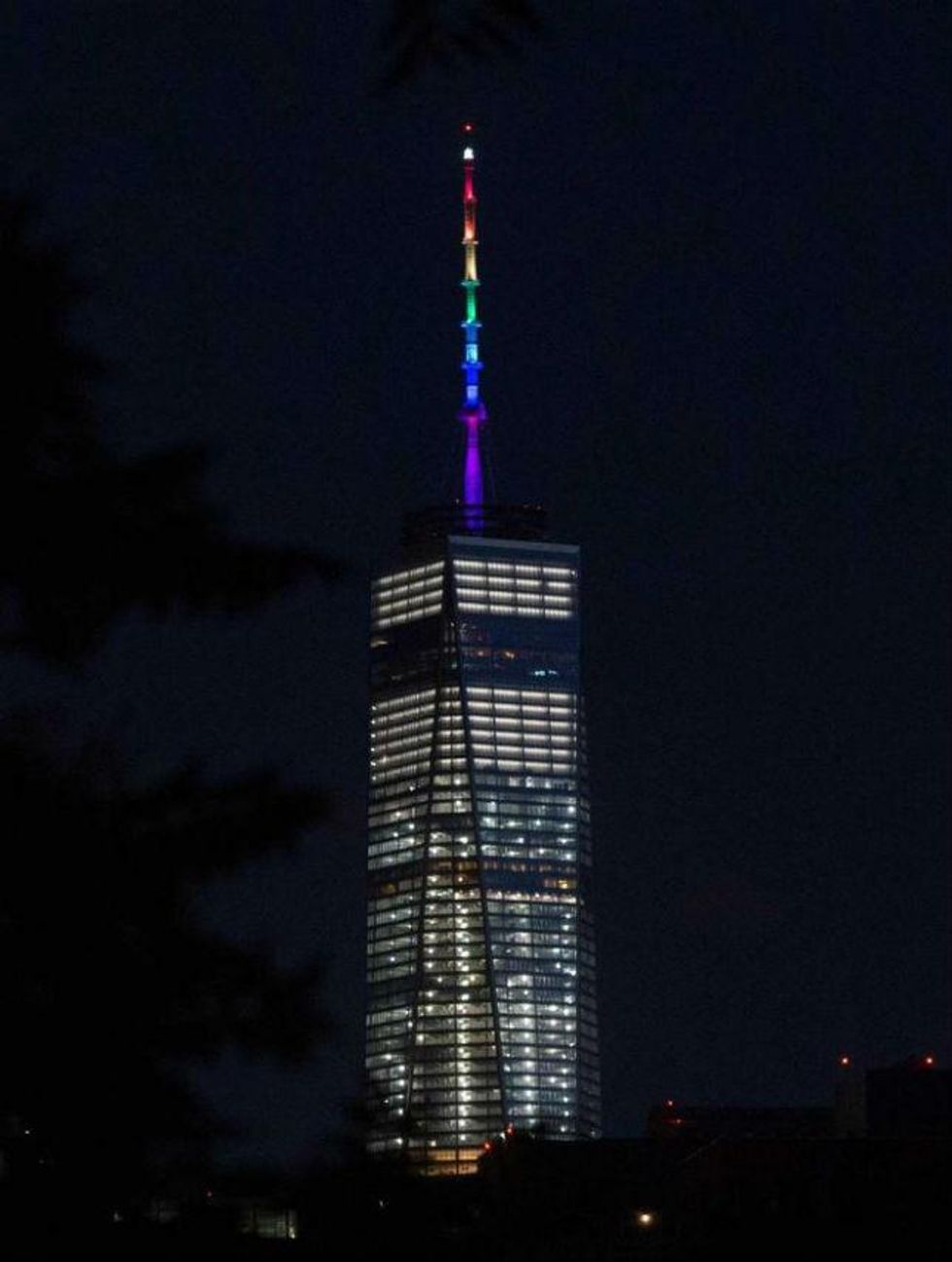 A World Trade Centre is lit up with the colours of the rainbow to commemorate the victims of the Orlando shooting.