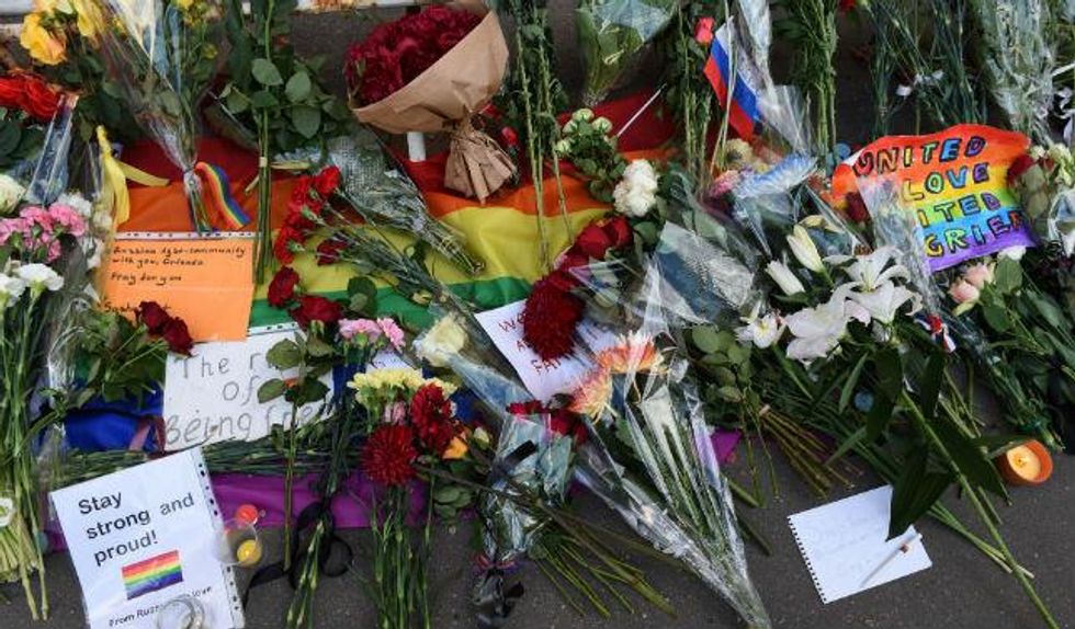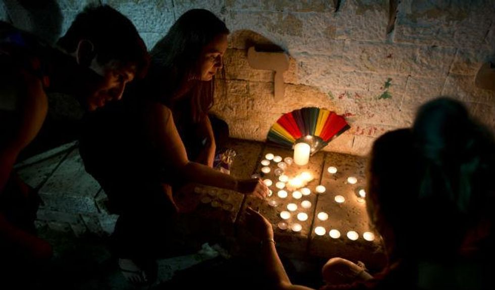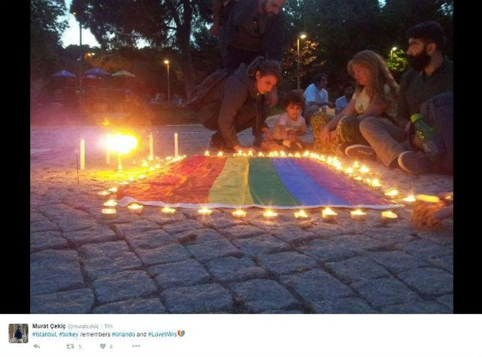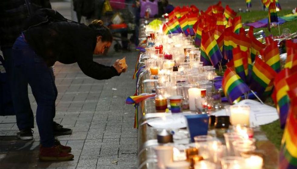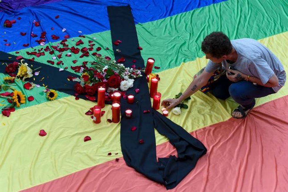 People leave candles on a rainbow flag in remembrance of the Orlando shooting victims.