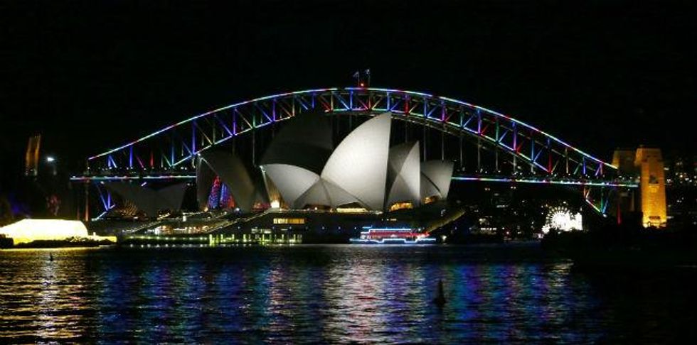 Behind the Sydney Opera House, the bridge is lit up in rainbow colours to remember the victims of the Orlando shooting.