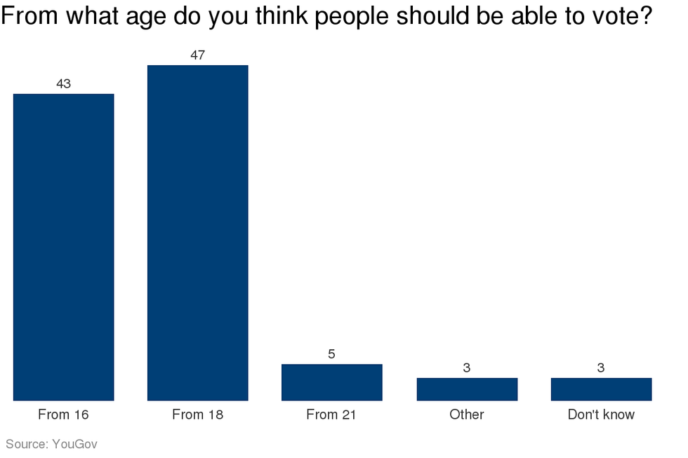 Although lowering the voting age would allow younger people an earlier vote, only 43 per cent say it should be lowered to 16, with a majority favouring the current age of 18.