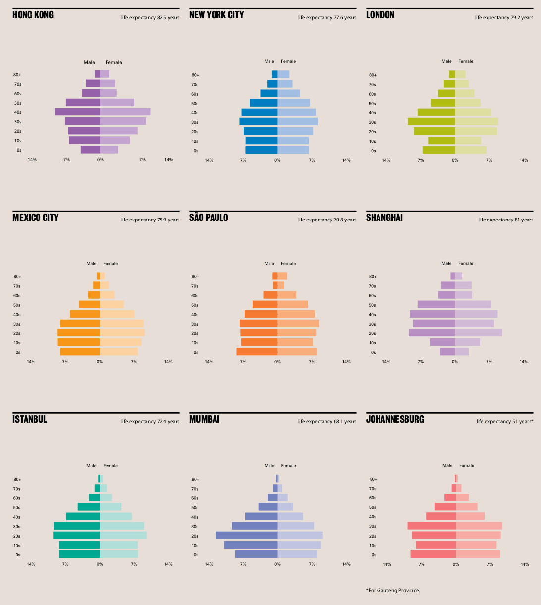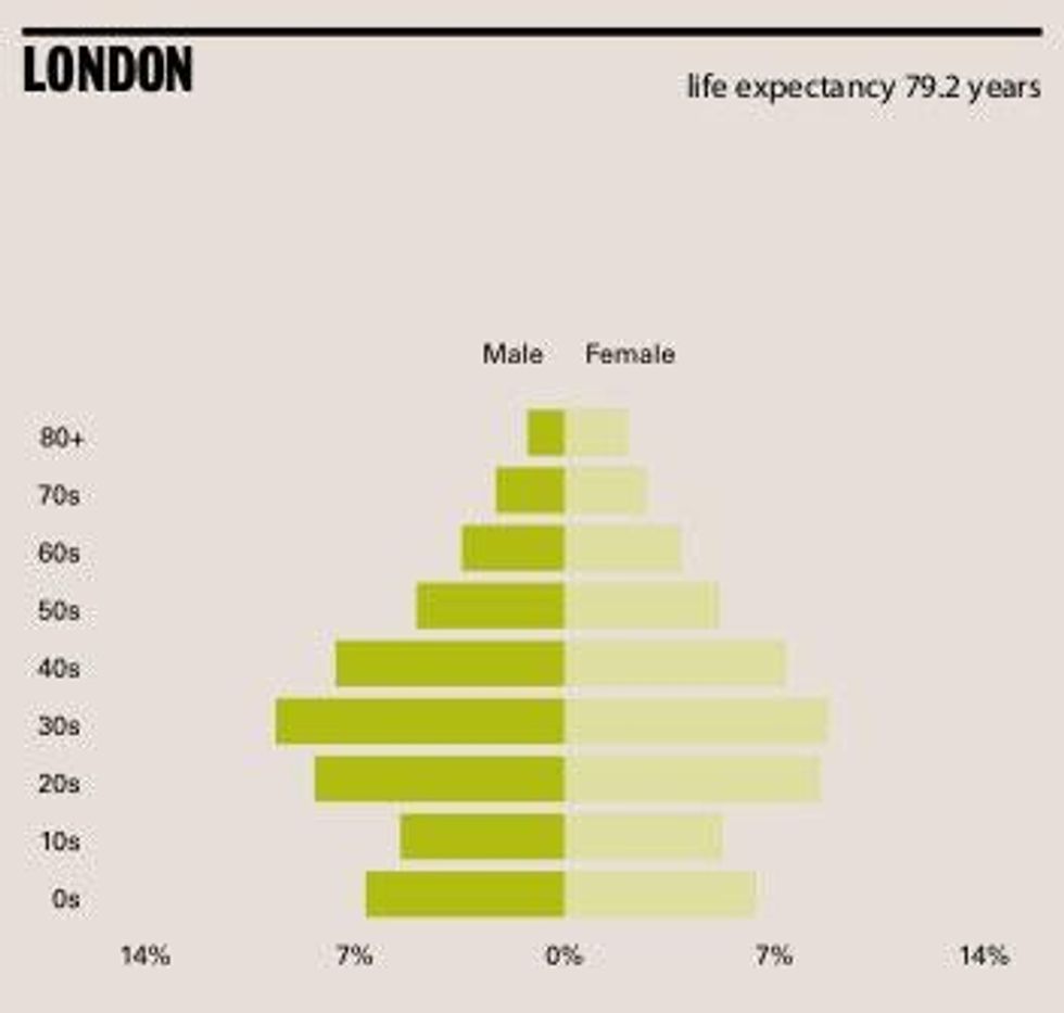 However, compared to cities like Mumbai and Mexico City, London has a more middle-aged spread.