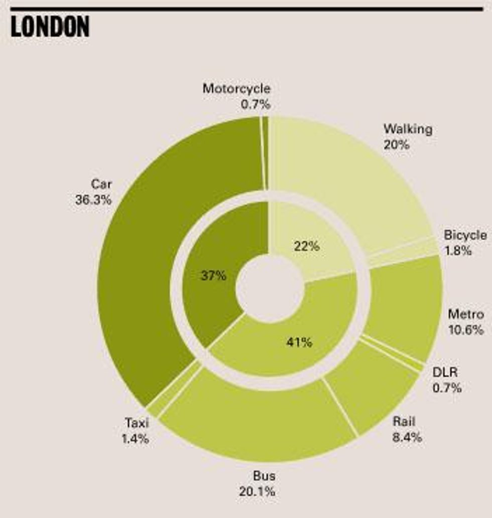 London also uses this network about as much as the average global city, with public transport accounting for 40 per cent of all trips.
