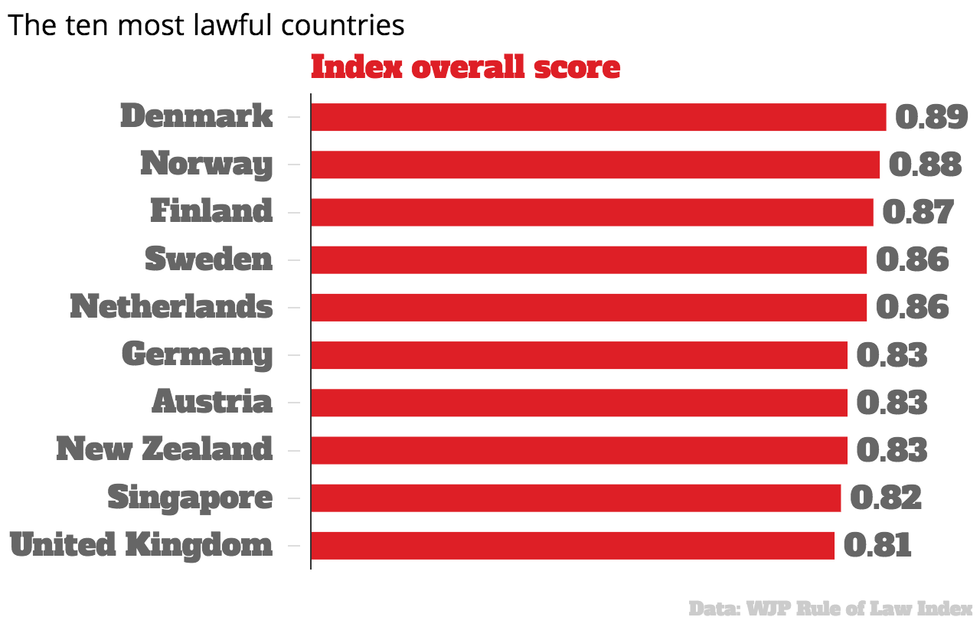 Western Europe and North America accounted for eight of the top 10 most lawful places in the index, which Denmark topped.