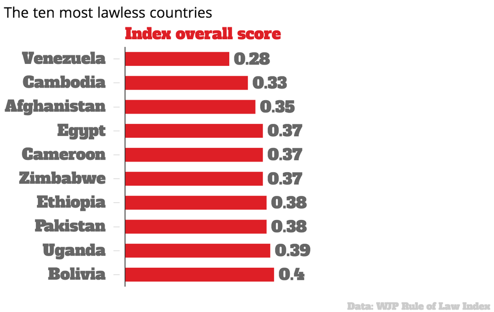 Venezuela is the most lawless country in the world according to the World Justice Project Rule of Law Index 2016.