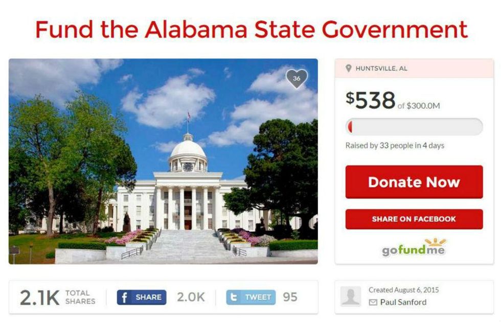 On a GoFundMe page, the Republican explained that the state legislature was looking at alternative ways of raising the money because increasing taxes would be so unpopular with the people of Alabama.