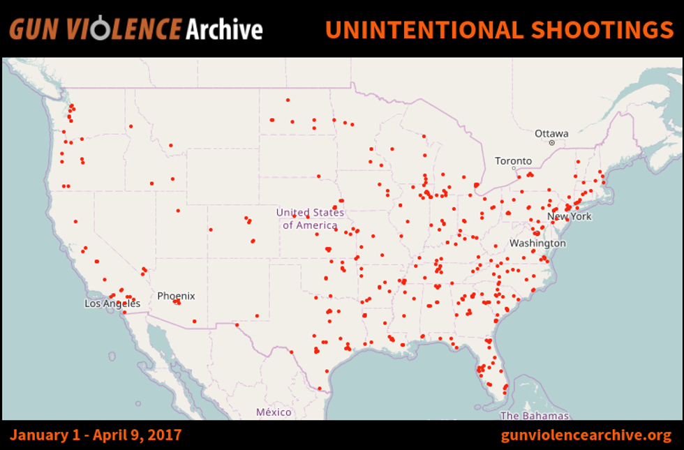 According to the Gun Violence Archive there have been 552 reported unintentional shootings in 2017 (five or six a day).