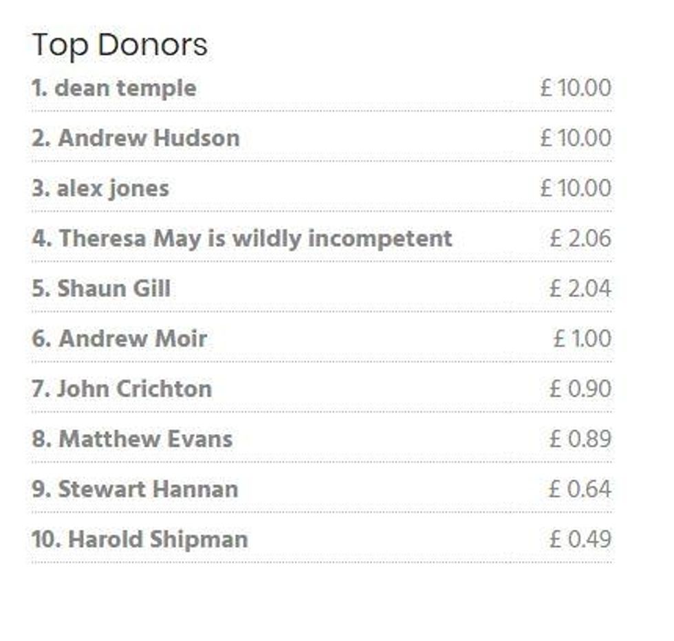 'Theresa May is wildly incompetent' briefly achieved the honour of top donor, by giving £2.06.