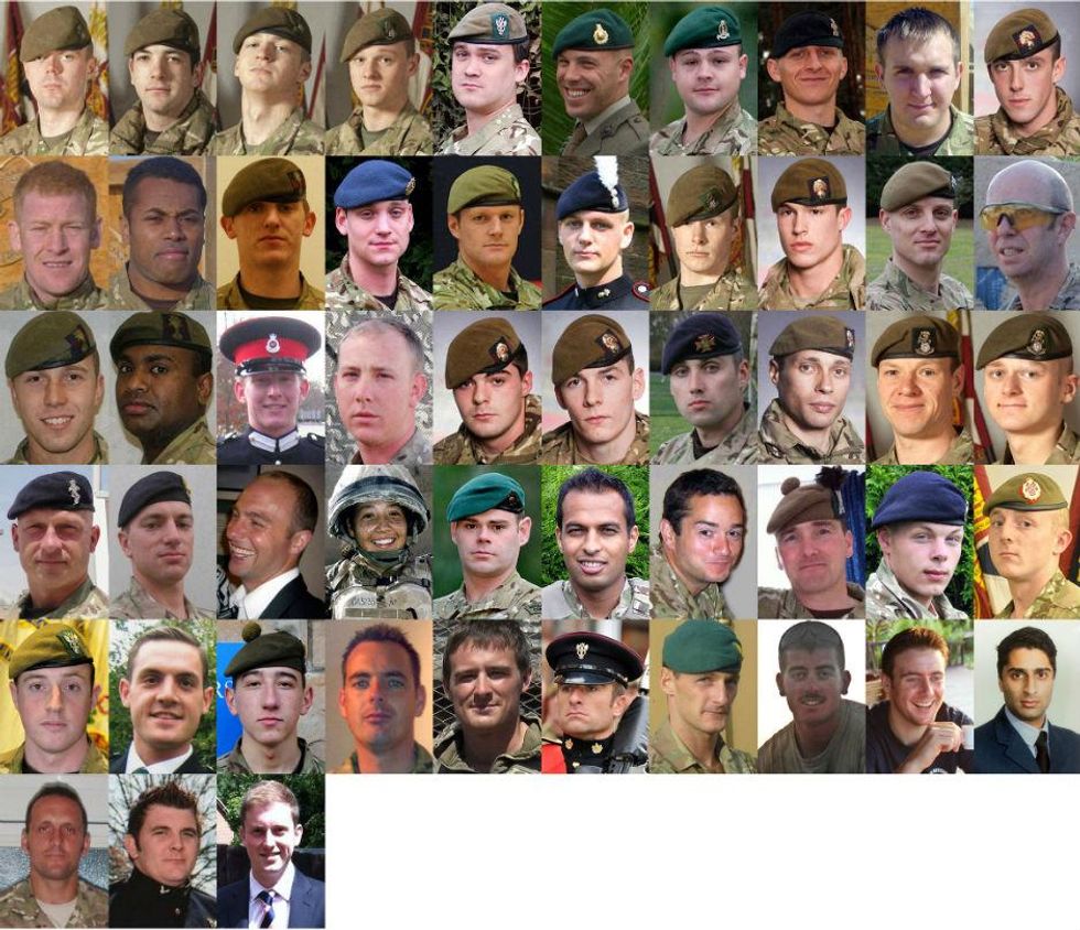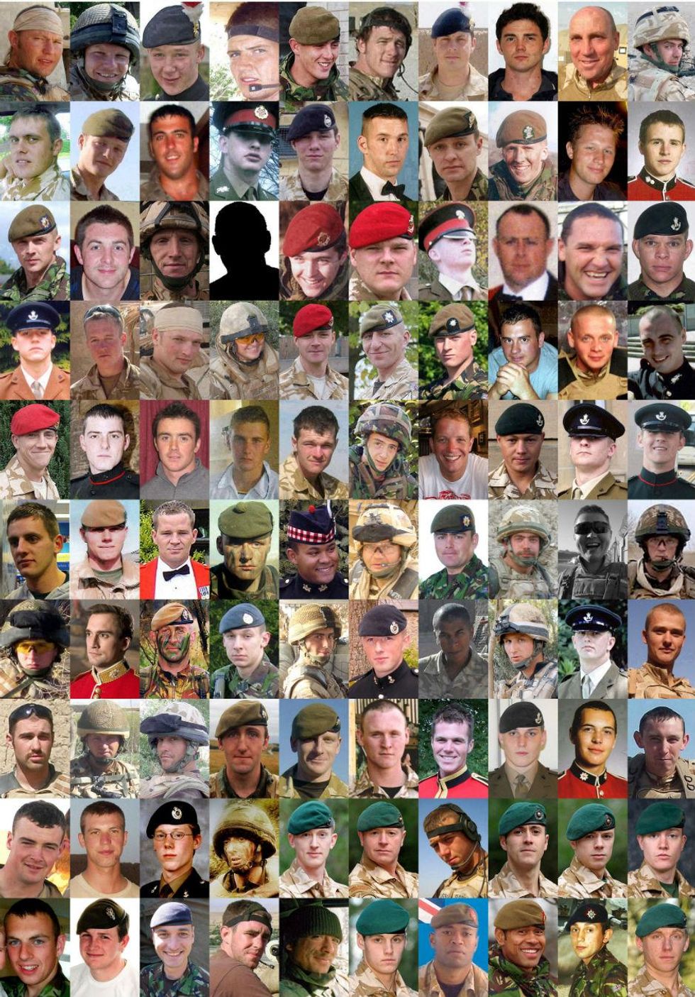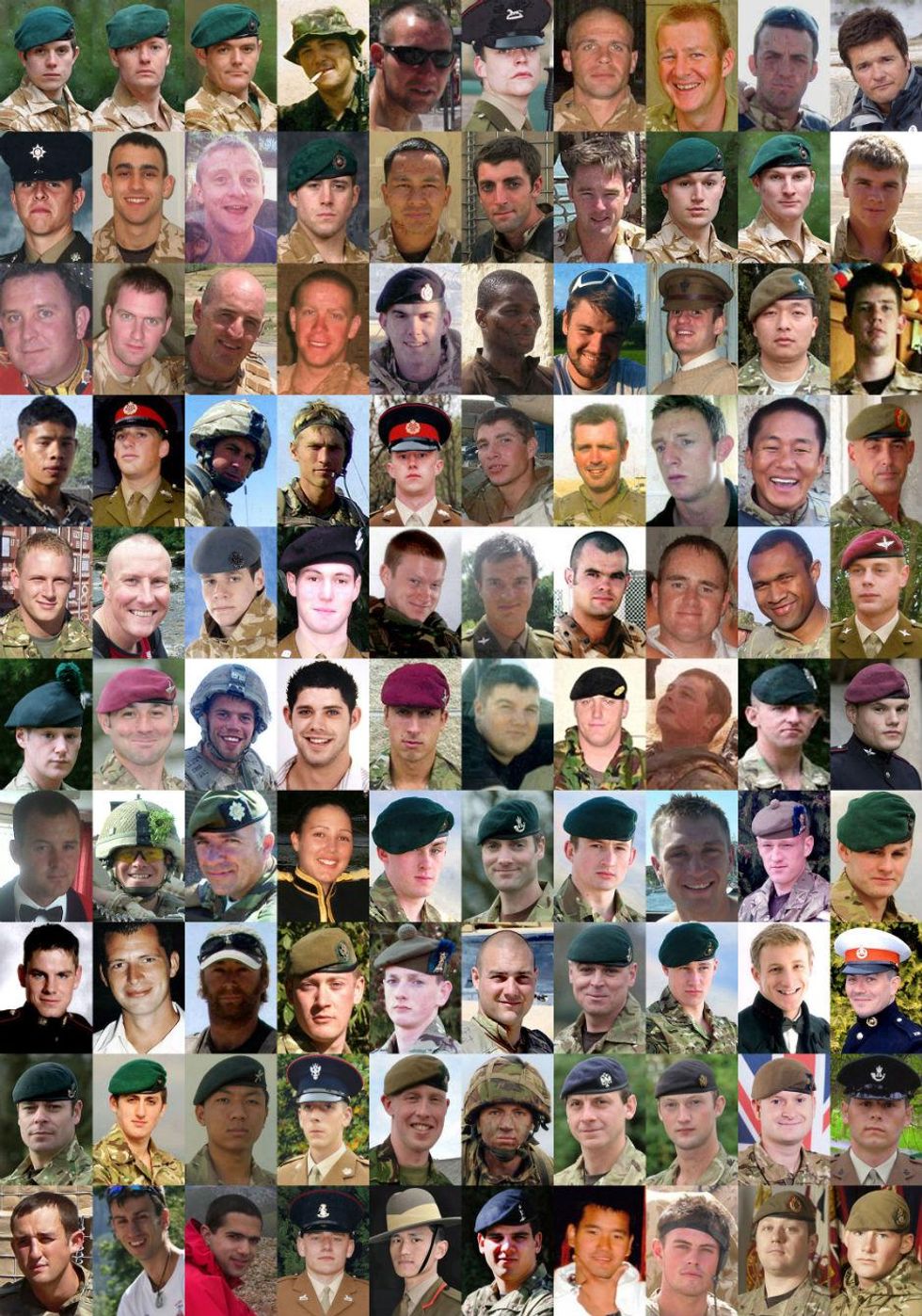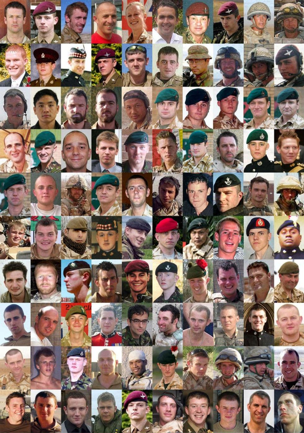 Line 1 Private Darren John George, from the Royal Anglian Regiment (silhouette), Corporal John Gregory of the Royal Logistic Corps, Sergeant Robert Busuttil of the Royal Logistic Corps, Private Jonathan Kitulagoda, the Rifle Volunteers, Lance Corporal Steven Sherwood, 1st Battalion, The Royal Gloucestershire, Berkshire and Wiltshire Light Infantry, Corporal Mark Cridge, 7 Signal Regiment, Lance Corporal Peter Edward Craddock, 1st Battalion The Royal Gloucestershire, Berkshire and Wiltshire Regiment, Captain Jim Philippson, 7 Parachute Regiment Royal Horse Artillery, Sergeant Paul Bartlett, Royal Marines, Captain David Patten, of the Parachute Regiment. Line 2 Lance Corporal Jabron Hashmi, Intelligence Corps, Corporal Peter Thorpe, Royal Signals, Private Damien Jackson, 3rd Battalion the Parachute Regiment, Lance Corporal Ross Nicholls, Blues and Royals, Second Lieutenant Ralph Johnson, Household Cavalry Regiment, Captain Alex Eida, Royal Horse Artillery, Private Andrew Barrie Cutts, Air Assault Support Regiment, Royal Logistic Corps, Private Leigh Reeves, Royal Logistic Corps, Lance Corporal Sean Tansey, The Life Guards, Corporal Bryan James Budd, 3rd Battalion the Parachute Regiment, 29. Line 3 Lance Corporal Jonathan Peter Hetherington, 14 Signal Regiment (Electronic Warfare), Ranger Anare Draiva, 1 Royal Irish Regiment, Mne Joseph David Windall, Royal Marines, Corporal Oliver Simon Dicketts, the Parachute Regiment, Sergeant Gary Paul Quilliam, Sergeant John Joseph Langton, Sergeant Benjamin James Knight, Flight Sergeant Adrian Davies, Flight Sergeant Gerard Martin Bell, Flight Sergeant Stephen Beattie. Line 4 Flight Sergeant Gary Wayne Andrews, Flight Lieutenant Steven Swarbrick, Flight Lieutenant Allan James Squires, Flight Lieutenant Gareth Rodney Nicholas, Flight Lieutenant Leigh Anthony Mitchelmore, Flight Lieutenant Steven Johnson, Private Craig O'Donnell, The Argyll and Sutherland Highlanders, 5th Battalion the Royal Regiment of Scotland, Corporal Mark William Wright, 3rd Battalion, The Parachute Regiment, Lance Corporal Luke McCulloch, 1 Royal Irish Regiment, Lance Corporal Paul Muirhead, 1 Royal Irish Regiment. Line 5 Marine Gary Wright, 45 Commando Royal Marines, Marine Jonathan Wigley, 45 Commando Royal Marines, Marine Richard J Watson, 42 Commando Royal Marines, Lance Bombardier James Dwyer, 29 Commando Regiment Royal Artillery, Marine Thomas Curry, 42 Commando Royal Marines, Lance Corporal Mathew Ford, 45 Commando Royal Marines, Marine Jonathan Holland, 45 Commando Royal Marines, Marine Scott Summers, 42 Commando Royal Marines, Lance Bombardier Ross Clark Lance Bombardier Liam McLaughlin. Line 6 Marine Benjamin Reddy, 42 Commando Royal Marines, WO2 Michael 'Mick' Smith, 29 Commando Regiment Royal Artillery, Private Chris Gray, A Company, 1st Battalion The Royal Anglian Regiment, Guardsman Simon Davison, 1st Battalion Grenadier Guards, Lance Corporal George Russell Davey, 1st Battalion the Royal Anglian Regiment, Guardsman Daniel Probyn, 1st Battalion Grenadier Guards, Corporal Darren Bonner, 1st Battalion The Royal Anglian Regiment, Corporal Mike Gilyeat, Royal Military Police, Lance Corporal Paul "Sandy" Sandford, 1st Battalion The Worcestershire and Sherwood Foresters, Guardsman Neil 'Tony' Downes, 1st Battalion Grenadier Guards. Line 7 Drummer Thomas Wright, 1st Battalion The Worcestershire and Sherwood Foresters, Captain Sean Dolan, of 1st Battalion The Worcestershire and Sherwood Foresters, Sergeant Dave Wilkinson, from 19 Regiment Royal Artillery, Guardsman Daryl Hickey 1st Battalion Grenadier Guards, Lance Corporal Alex Hawkins, of 1st Battalion The Royal Anglian Regiment, Guardsman David Atherton, from the 1st Battalion Grenadier Guards, Sergeant Barry Keen of 14 Signal Regiment, Lance Corporal Michael Jones, Private Tony Rawson, 1st Battalion The Royal Anglian Regiment, Captain David Hicks of 1st Battalion The Royal Anglian Regiment. Line 8 Private Aaron James McClure, Private Robert Graham Foster, and Private John Thrumble, all from the 1st Battalion The Royal Anglian, Senior Aircraftman Christopher Bridge from C flight, 51 Squadron RAF, Private Damian Wright, of 2nd Battalion The Mercian Regiment, Private Ben Ford, of 2nd Battalion The Mercian Regiment, Private Johan Botha from The 2nd Battalion of The Mercian Regiment (Worcesters and Foresters), Sergeant Craig Brelsford from The 2nd Battalion of the The Mercian Regiment (Worcesters and Foresters), Lance Corporal Ivano Violino from 20 Field Squadron, 36 Engineer Regiment, Colour Sergeant Phillip Newman of 4th Battalion The Mercian Regiment. Line 9 Private Brian Tunnicliffe of 2nd Battalion The Mercian Regiment, Major Alexis Roberts, 1st Battalion The Royal Gurkha Rifles, Lance Corporal Jake Alderton of 36 Engineer Regiment, Captain John McDermid of The Royal Highland Fusiliers, Trooper Jack Sadler of The Honourable Artillery Company, Sergeant Lee Johnson of 2nd Battalion The Yorkshire Regiment, Corporal Darryl Gardiner of the Royal Electrical and Mechanical Engineers, Corporal Damian Stephen Lawrence of the 2nd Battalion The Yorkshire Regiment, Royal Marine Corporal Damian Mulvihill, Marine David 'Dave' Marsh of 40 Commando Royal Marines. Line 10 Lieutenant John 'JT' Thornton of 40 Commando Royal Marines, Senior Aircraftman Graham Livingston of the Royal Air Force Regiment, Senior Aircraftman Gary Thompson of the Royal Auxiliary Air Force, Trooper Robert Pearson of the Queen's Royal Lancers, Trooper Ratu Babakobau of the Household Cavalry Regiment, James Thompson (no more details given), Dale Gostick, of 3 Troop Armoured Support Company, Royal Marines, Private Charles Murray of 2nd Battalion, the Parachute Regiment (2PARA), Private Daniel Gamble of 2nd Battalion, the Parachute Regiment (2PARA), Private Nathan Cuthbertson of 2nd Battalion, the Parachute Regiment (2PARA). Line 11 Lance Corporal James Bateman, 2nd Battalion The Parachute Regiment (2 Para), Private Jeff Doherty, of 2nd Battalion The Parachute Regime