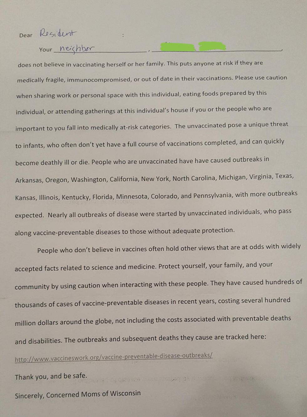 As a response, a group of Wisconsin parents penned a thorough letter outing their anti-vax neighbour for making them unsafe. They explained the exact risks that this presents and listed the many states dealing with outbreaks due to anti-vaxxers.