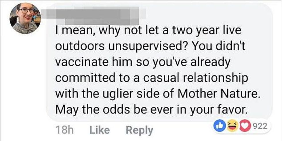 One Facebook user jokingly wrote: “My daughter Epsom Salt (not vaccinated) wants to make her home among the wild squirrels in our backyard and I’m looking for recommendations of feeders large enough to accommodate a 1 year old girl. Her favorite [sic] color is rabies red. Please don’t turn this post into a debate, REBECCA.