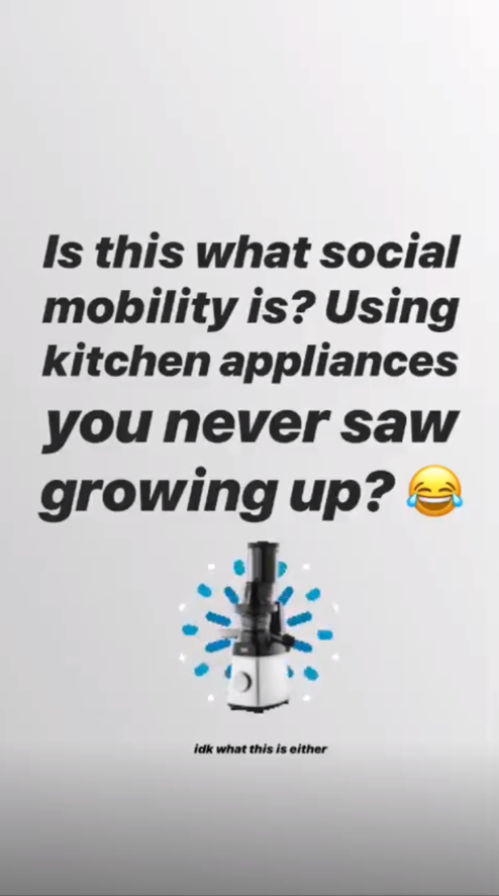 After learning about the useful feature, the 29-year-old joked on Instagram: “Is this what social mobility is? Using kitchen appliances you never saw growing up?”