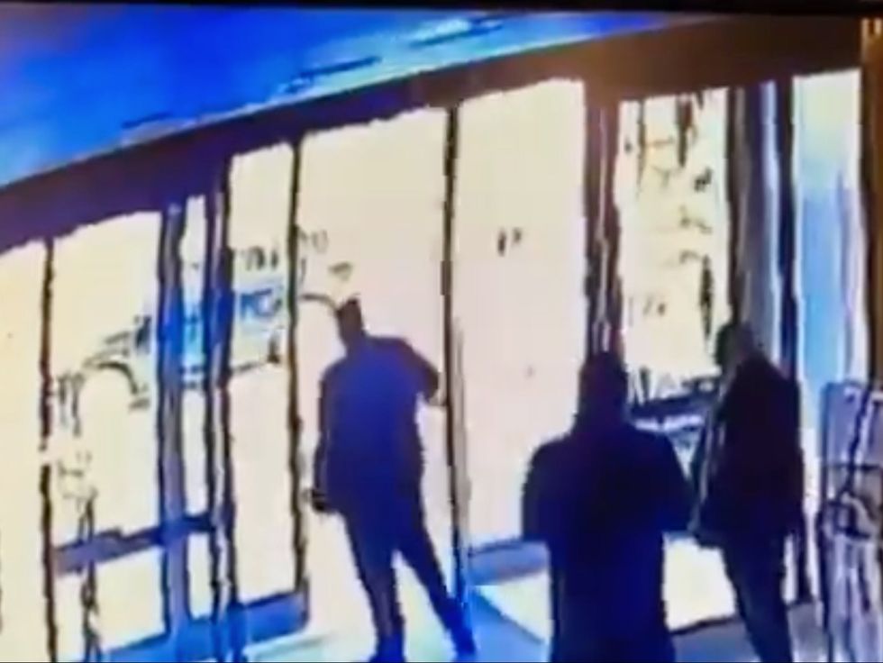 But they don’t rush to the victim’s aid either. Instead, one of them – understood to be the building’s security guard – walks calmly over and shuts the door.
