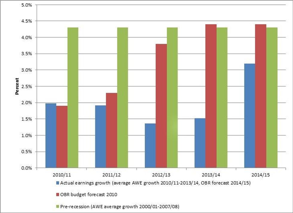 As the TUC notes, if earnings growth between 2010/11 and 2014/15 had been in line with the OBR’s forecast during the June 2010 Budget, the Treasury would have made £175.6bn in income tax receipts in 2014/15 - £17.1bn higher than the estimated figure.