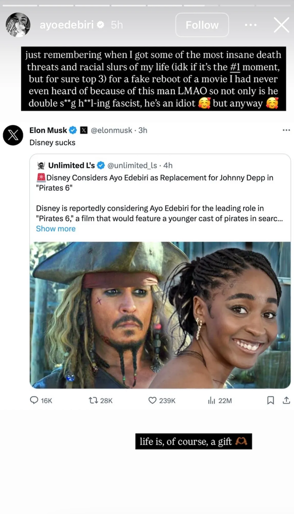 In a recent Instagram story, the 29-year-old revealed that she received “insane death threats” and “racial slurs” last year after Musk reposted a story on his X/Twitter account that claimed Disney was considering casting Edebiri to replace Johnny Depp in a Pirates of the Caribbean reboot.