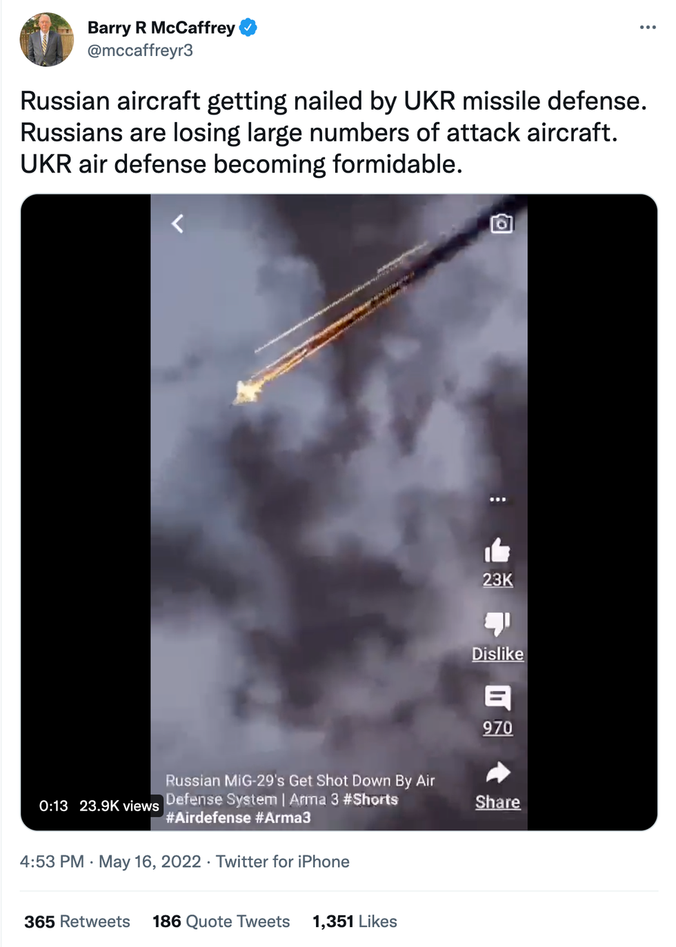 Barry McCaffrey, retired 4star general, Clinton appointee and Trump Russia collusion hoax peddler tweets Digital Combat Simulator (DCS) video game footage and tries to pass it off as video evidence of Ukrainian Air superiority over Russia. (Deletes tweet)pic.twitter.com/5h2oLUY7hQ— Rising serpent \ud83c\uddfa\ud83c\uddf8 (@Rising serpent \ud83c\uddfa\ud83c\uddf8) 1652741165