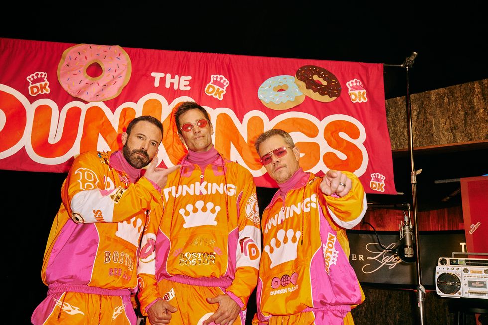 Ignoring advice, Affleck storms into the studio with his band, declares “Here comes the Boston Massacre”, and performs a song about Dunkin.