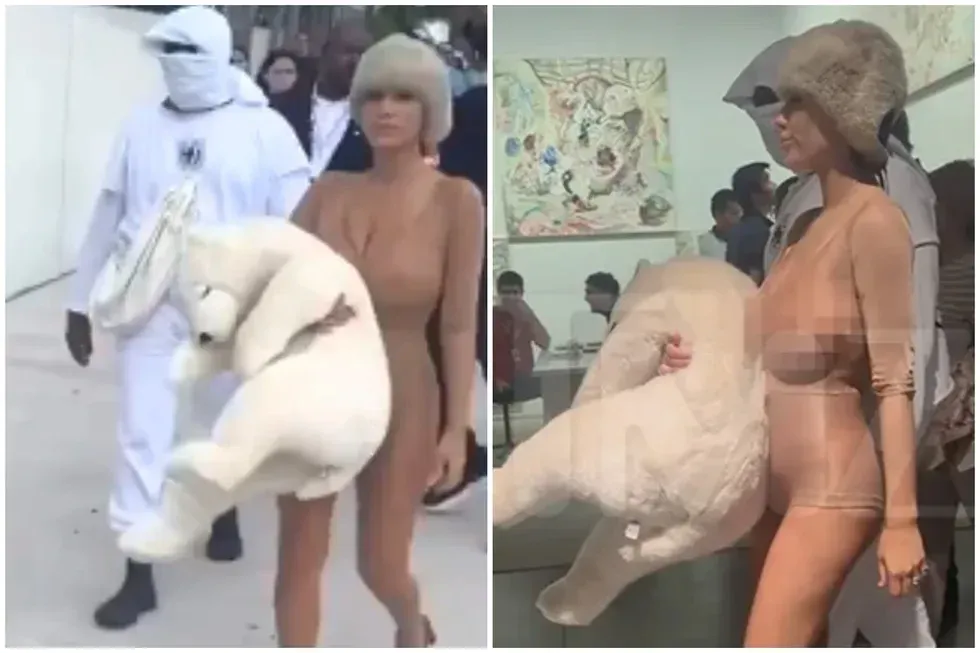 At Miami’s Art Basel in 2023, Bianca Censori turned heads by ditching traditional clothing and stepping out in barely-there tights, a furry hat, and a plush white polar bear slung under her arm like an oversized handbag.