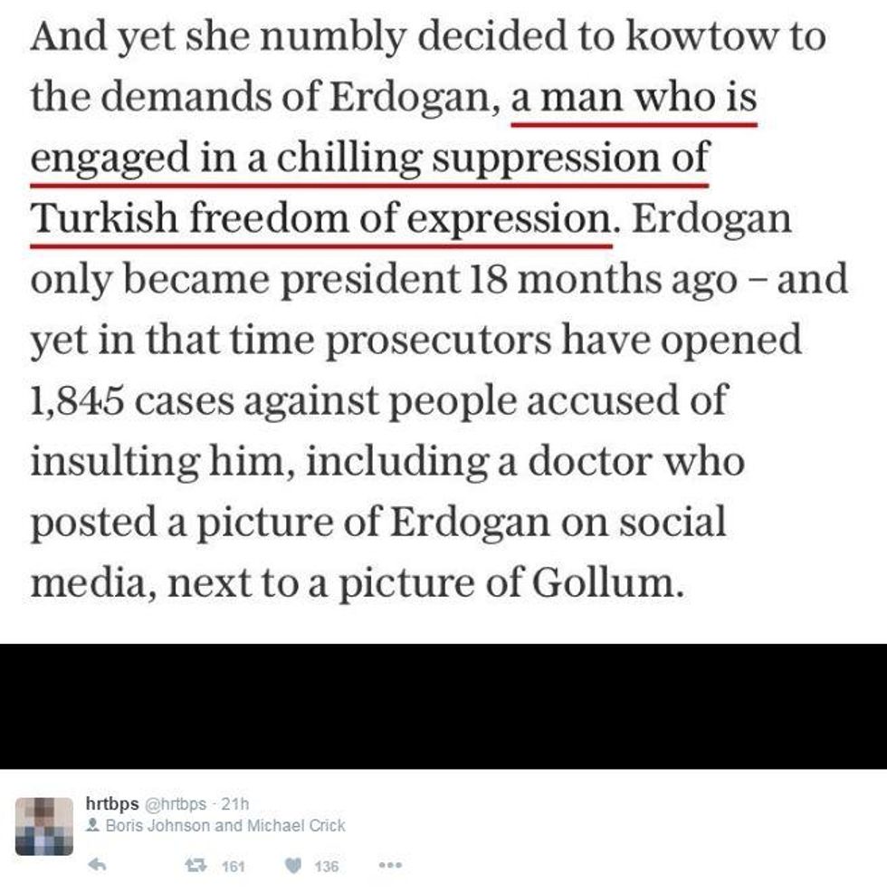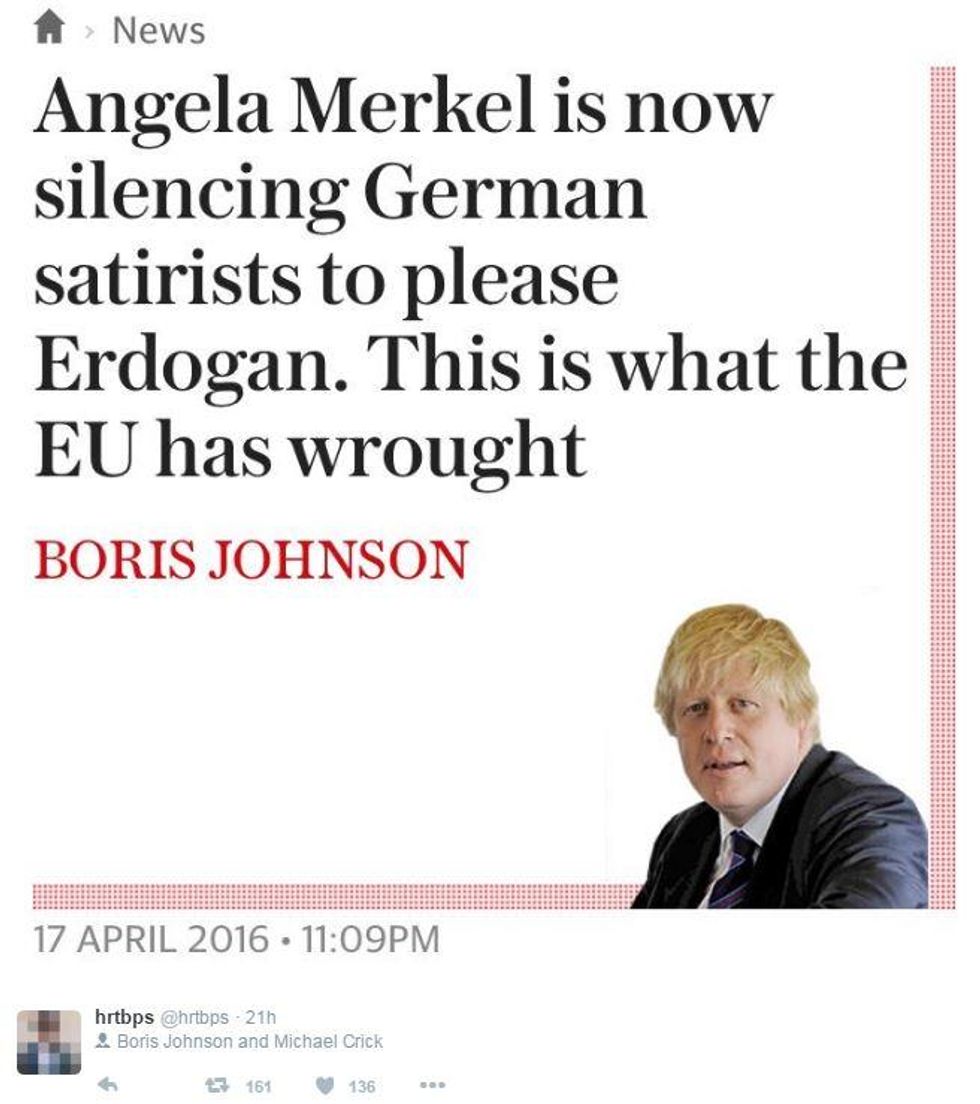 For example, in April Johnson condemned German chancellor Angela Merkel for kow-towing to Turkey's Recep Tayyip ErdoÄŸan over a German satirist's verbal attacks on the authoritarian president.