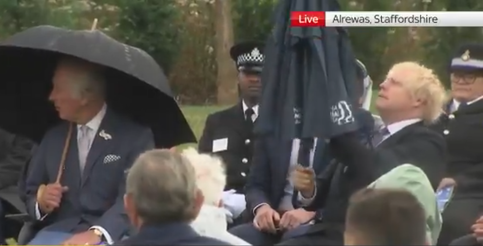 British prime minister Boris Johnson had a momentary disaster with an umbrella today while sat next to, of all people, Prince Charles.