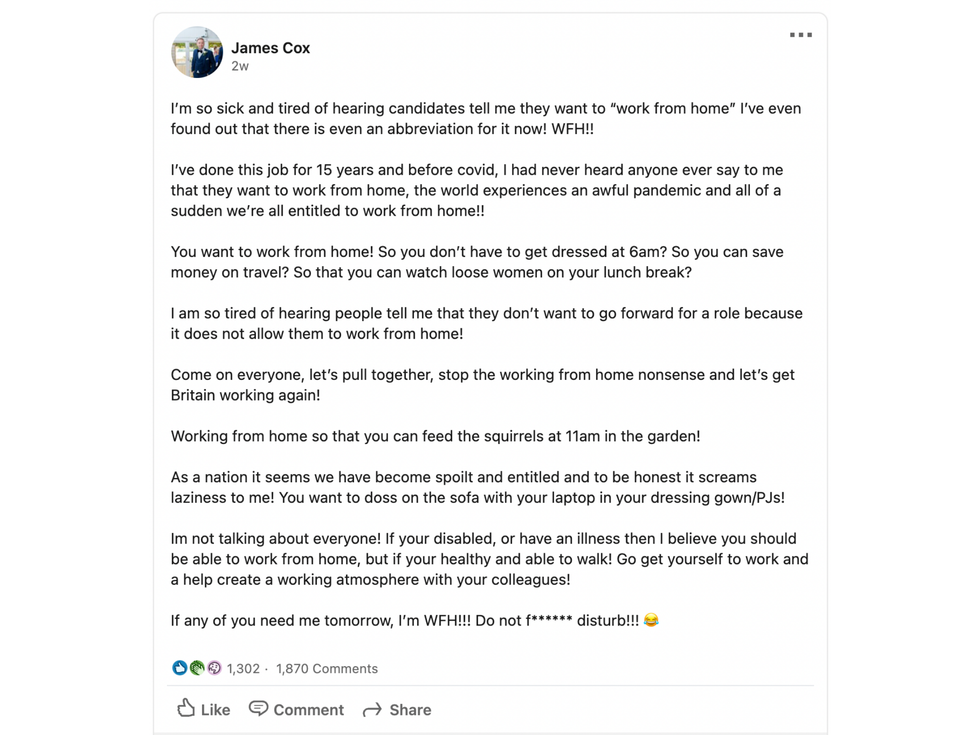 A company owner and boss has come under fire for a LinkedIn rant about people who want to work from home.