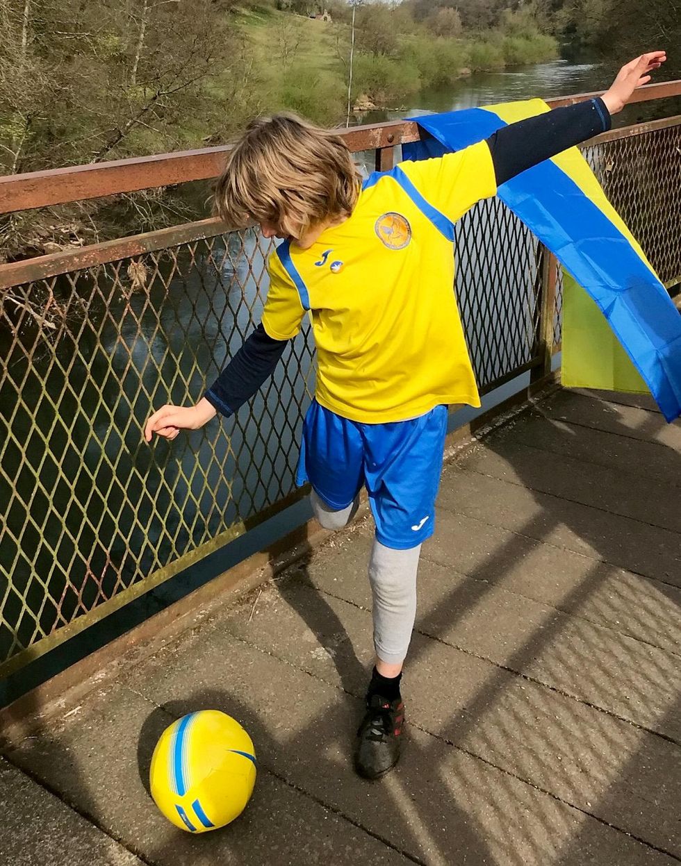 A young boy has kicked a football more than 10,000 times in over a 12-mile stretch to raise £1,500 for those in war-torn Ukraine.