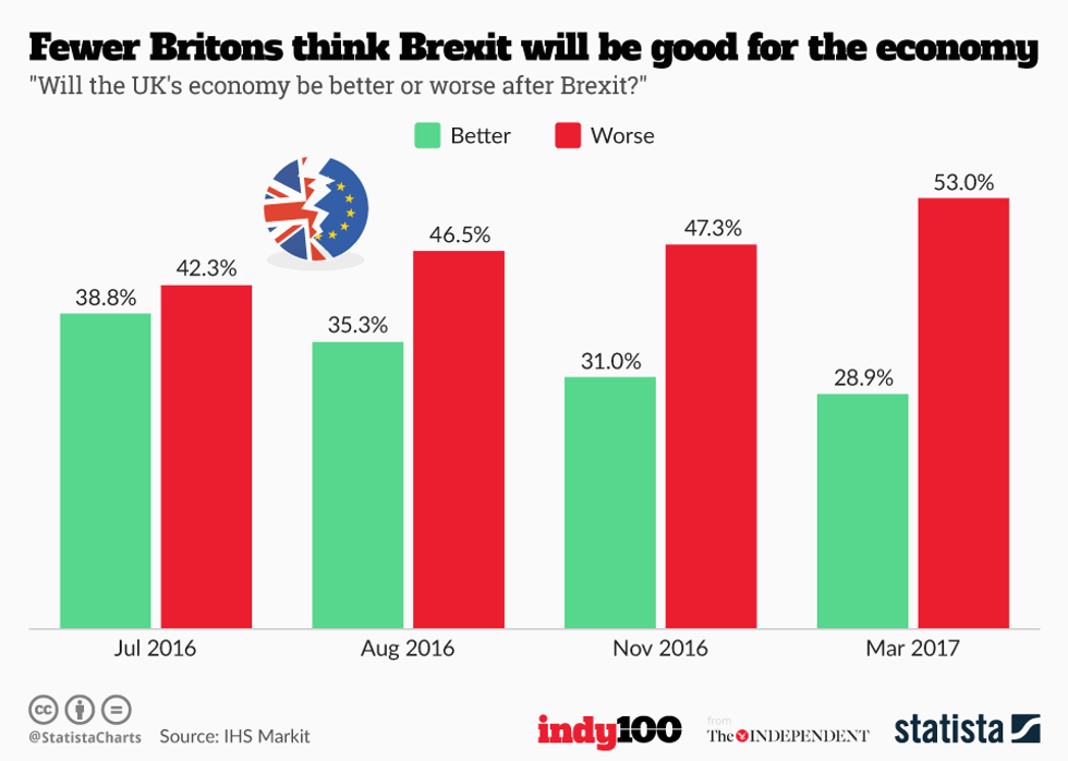 Since the vote in June of last year, fewer and fewer people think Brexit will benefit the UK from an economic standpoint.