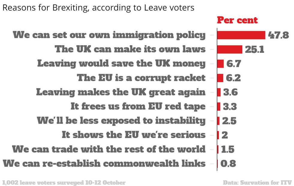 This is according to a Survation survey for ITN published on Tuesday which found concern about immigration outranked other stated motivations, such as EU corruption, red tape, bailing out countries such as Greece or Portugal and greater trade options.