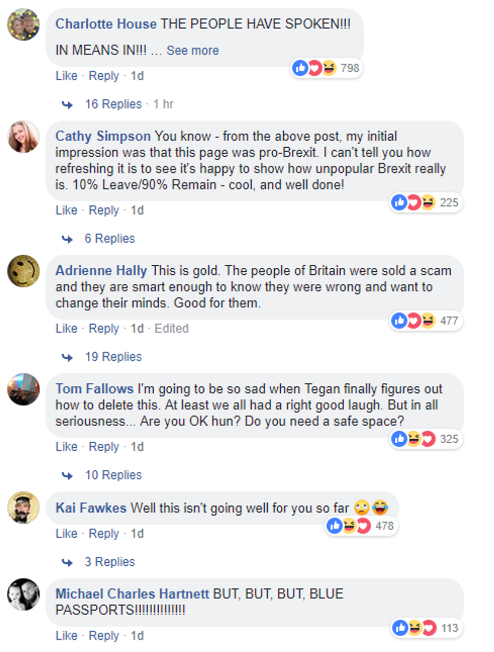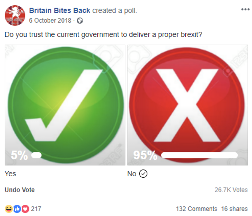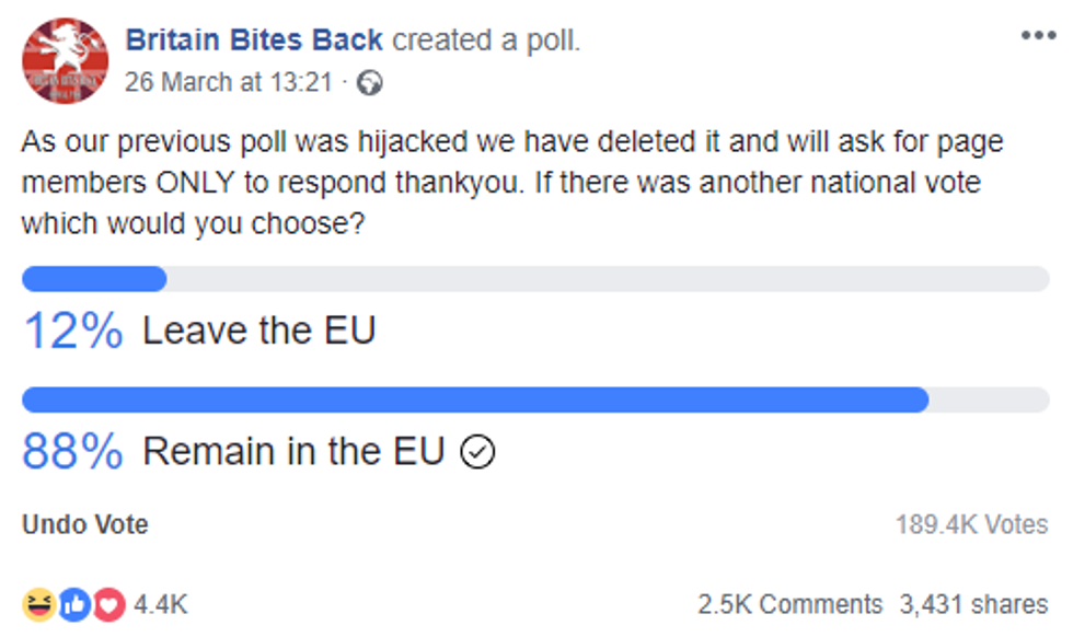 A parody pro-Brexit Facebook page called 'Britain Bites Back' launched a second referendum poll and it came out exactly as you'd expect.