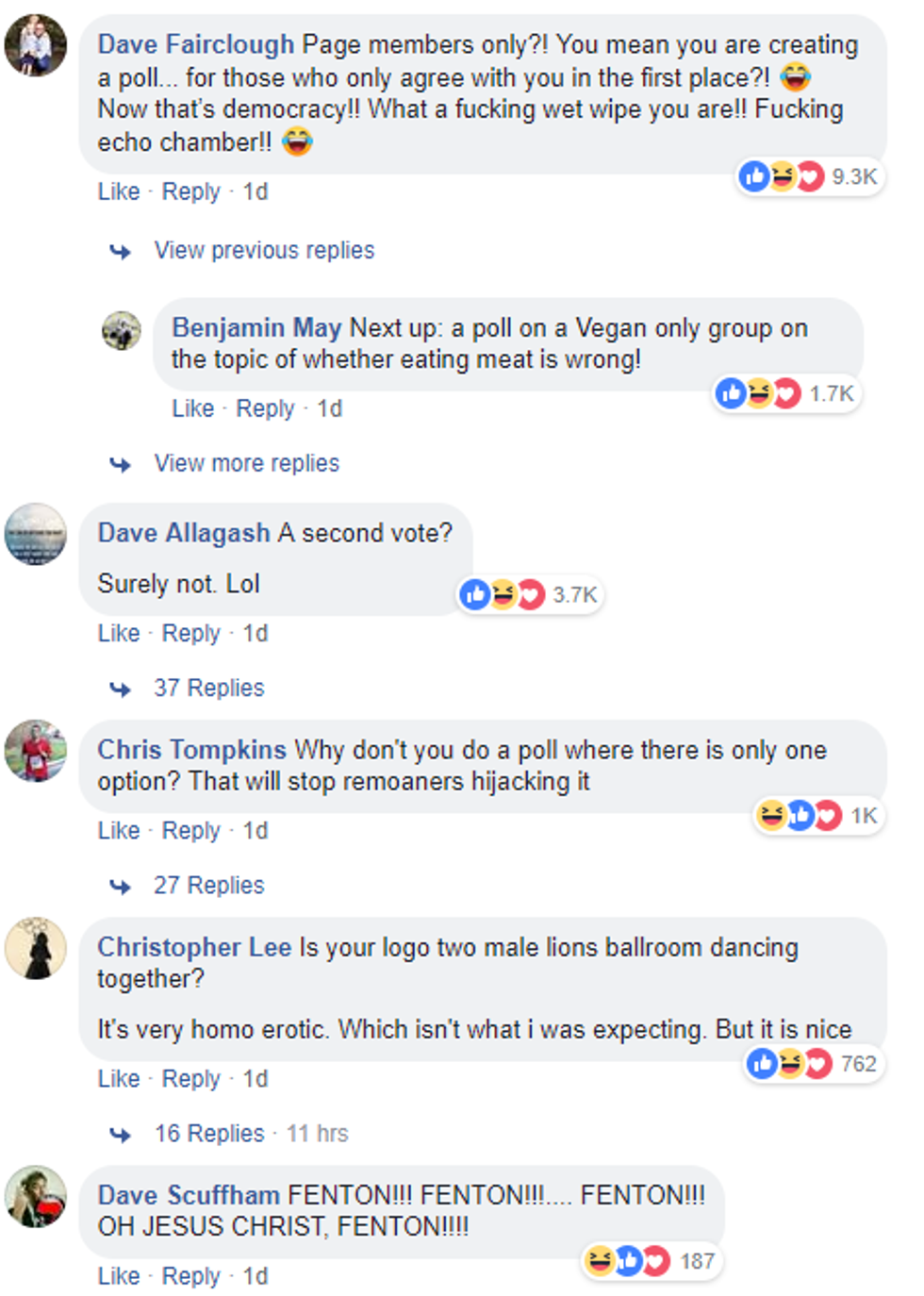 The page Britain Bites Back, which appears to be a parody page (it's fans appear to be a mix of both leave and remain supporters, some of whom don't appear to be in on the joke) decided to run a poll on Facebook, in response to the Revoke Article 50 poll, which has now been signed by nearly 6 million people.