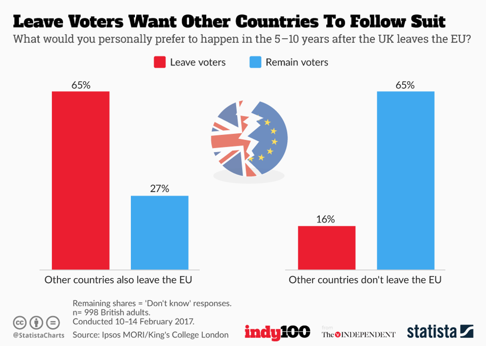 As the below chart by Statista shows, although respondents were fairly evenly split over whether they wanted countries to leave the EU or not (42 per cent and 43 per cent), they were split into relatively obvious camps of thought: