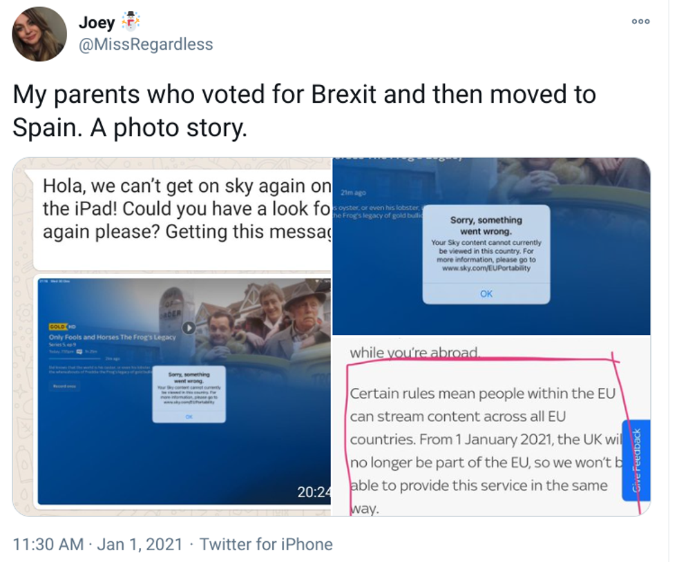 On 1 January, Twitter user @missregardless shared some Whatsapp messages that she was sent by her Brexit-voting parents, who now live in… Spain.
