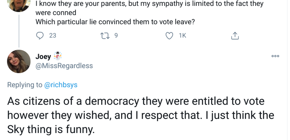 Lots of the replies were less than sympathetic, but Joey clarified that she respects her parents’ right to vote however they want and just thought it was funny.