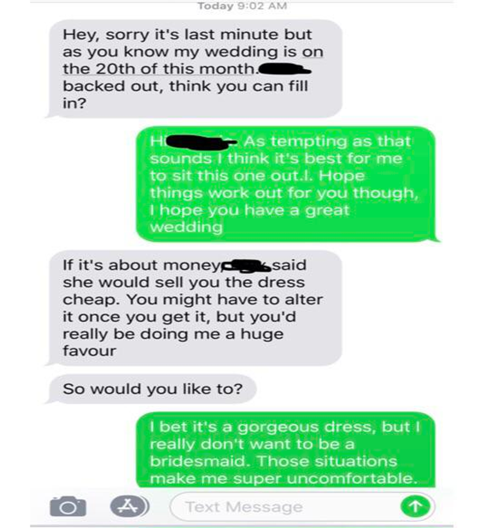 It starts off fairly civilised, as the unnamed bride asks if the poster can step in and cover for a bridesmaid who has pulled out at the last minute.