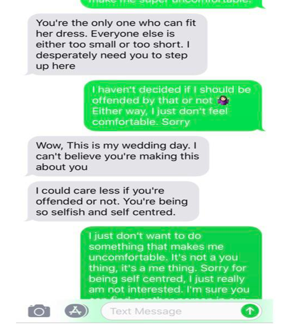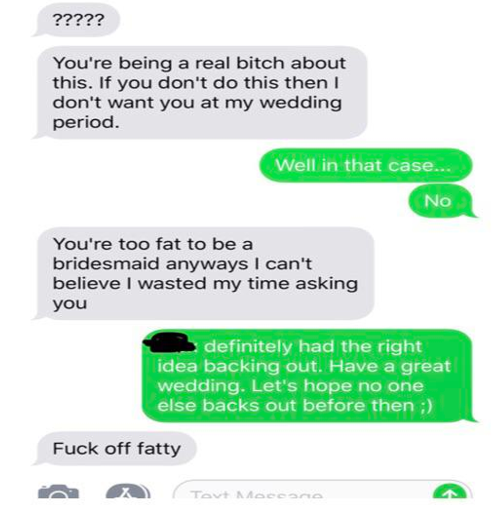 Finally, when all else fails, the cousin goes full-on bridezilla, disinviting her from the wedding altogether, calling her a "real bitch", and outrageously saying she was "too fat" to be in the wedding.