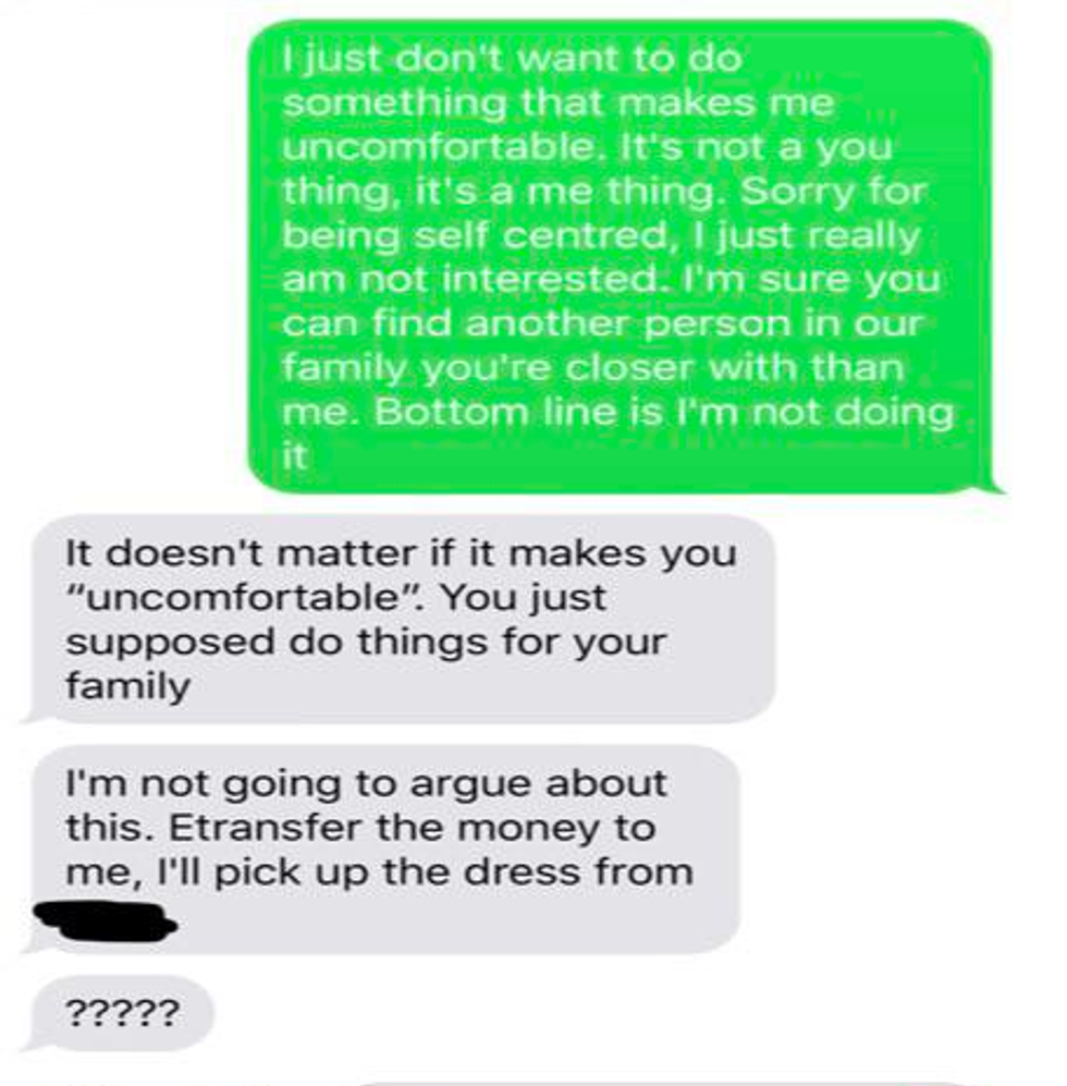 Despite the poster repeatedly saying she is not comfortable being a bridesmaid, her words seem to fall on willfully deaf ears, and the cousin starts demanding she transfer her money for the bridesmaid's dress she does not want.